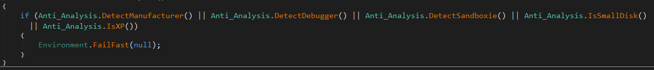 ASyncRAT does a number of anti-analysis checks, such as checking to see if it’s inside a debugger or sandbox, and checking the disk size (most secure labs tend to be quite small, especially cloud-based sandboxes). If there is a debugger or sandbox detected, or the disk is too small, the malware will terminate execution.