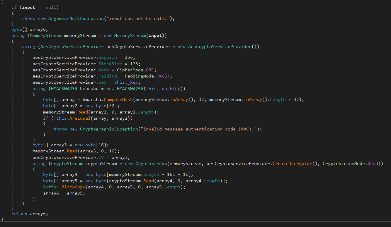 check in the code block above. AsyncRAT needs to verify the integrity of it’s configurations and return a true