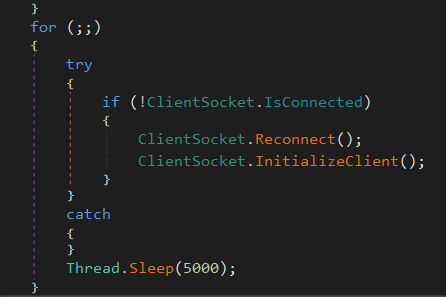 ASyncRAT creates an infinite loop to connect to the C2 (defined through the builder), alongside routinely checking in with the C2 server. Between these checks, the ASyncRAT will sleep