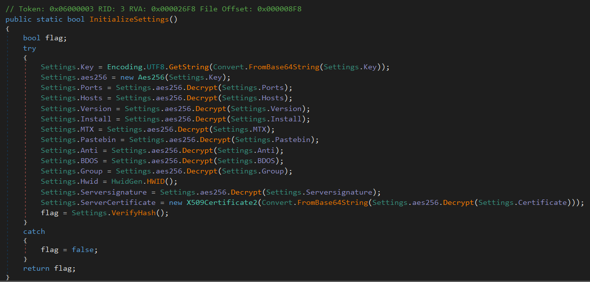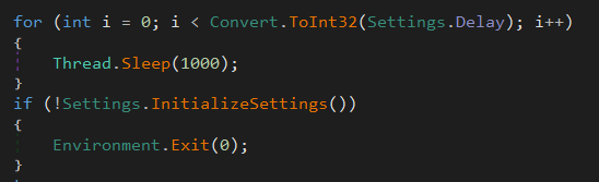 AsyncRAT begins it’s execution process by sleeping for one second before going through the rest of its initialisation, the sleep time is set by the attacker when they compile their sample in the builder (more on that later). In addition, AsyncRAT initialises itself using its settings, and if this errors in any way, AsyncRAT terminates it’s execution.
