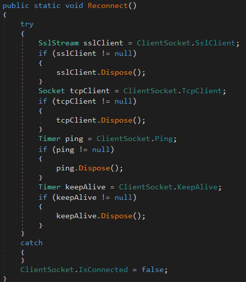 This method is forcefully disconnecting the client from a remote server by disposing of its SSL stream, TCP socket, and any timers related to communication (likely a keep-alive or ping mechanism as mentioned earlier).