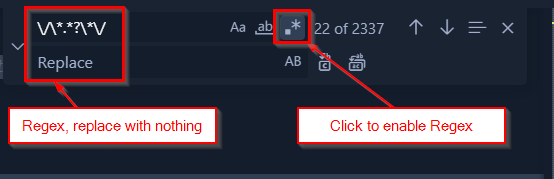 Now, we could go line by line and get rid of all the comments, but thats boring and takes too long, so let’s use Regular exxpressions. Regular expressions (regex) are patterns used to match character combinations in strings. In programming, they are often used for searching, validating, extracting, or replacing text within strings. Regex can be powerful, allowing you to specify complex search patterns with concise syntax. We are going to use it here.