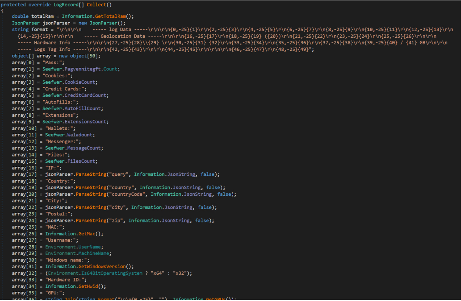 When the stealer is built and configured without obfuscation, it’s pretty straightforward to identify the various functions and methods for gathering data from the victim machine, including system information and the presence of antivirus products.
