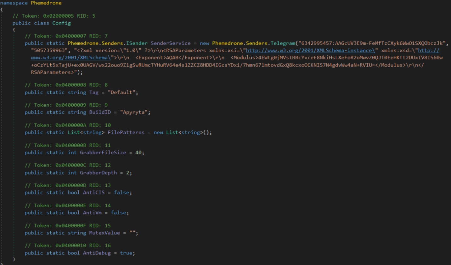 Shown below is configuration data from a sample captured in August 2024. As shown uses a telegram bot as the C2, and has a setting for AntiCIS